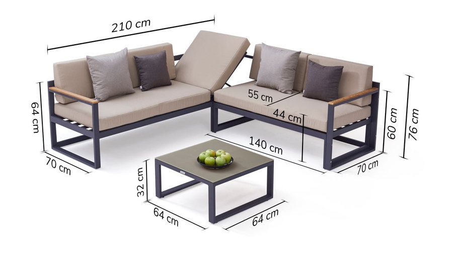 Eine weitere Lounge aus der Kollektion 2020, die nicht nur stilvoll, sondern auch praktisch und vielseitig ist. Das Ecksofa bietet Platz für 5 Personen. Die Lounge wirkt offen und lädt mit den gemütlichen Polsterauflagen nicht nur zum Entspannen ein. Im Handumdrehen verwandelt sich die Sitzfläche des 3er Sofas in eine gemütliche Liege - einem Sonnenbad steht nichts mehr im Wege! Das Zweiersofa kann durch die Montage der beiden mitgelieferten Armlehnen als einzelnes Sofa genutzt werden, oder mit dem Dreiersofa zu einer Ecklounge kombiniert werden. Auch die Rückenauflagen in Keilform bieten absoluten Komfort. Der passende kleine Tisch ist ebenfalls pulverbeschichtet, die Milchglasplatte harmoniert farblich und fügt sich in das Gesamtkonzept perfekt ein. Armlehnen in Teakholzoptik lassen die gesamte Garnitur lässig und modern erscheinen. Alle Teile der Garnitur können auch einzeln aufgestellt werden. Die farblich abgestimmten Dekokissen in graphit und grau gehören zum Lieferumfang.