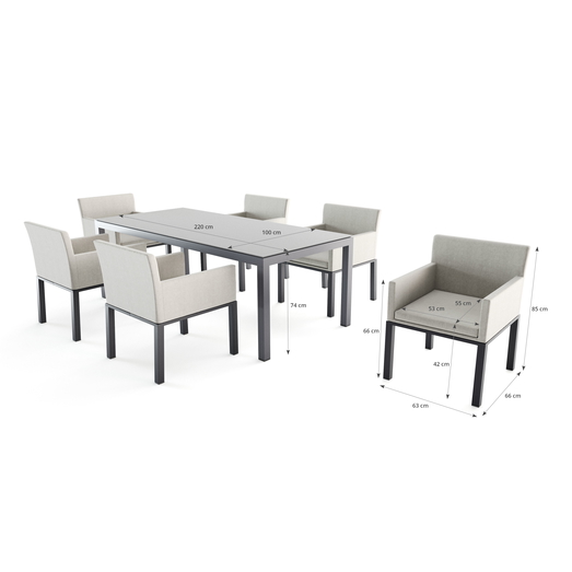 SKU 23581 Kissen & Auflagen 5 cm dicke Sitzauflage, Schaumstoff, hoher Sitzkomfort Eigenschaften pflegeleicht Material Aluminium, Polster Montage Montage erforderlich Tischplatte Klarglas, glatt, dunkelgrau, matt, Stärke 5 mm Lieferumfang 1x Esstisch, 6x Stuhl Sitzplätze bis zu 6 Obermaterial einfarbig, durchgefärbt, weiche Oberfläche, Schaumstofffüllung Gestell Aluminium, pulverbeschichtet, robust, rostfrei, wetterbeständig Produktart Essgruppen Bezug 100% Polyester, abnehmbar, waschbar bei 30°C, robuste Verarbeitung, verdeckte Reißverschlüsse Farbe anthrazit Gewicht ca. 76 kg Armlehnen mit Armlehnen Sicherheitshinweise
