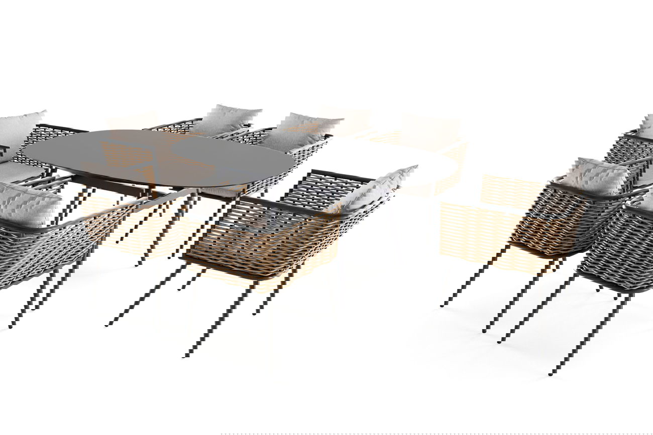 Die Stühle des Astra Dining Sets bestechen durch ihr Aluminiumgestell, das mit robustem, wetterbeständigem Polyrattan in einem eleganten Beige veredelt ist. Die Armlehnen und Rückenlehnen sind sorgfältig mit Rattan durchzogen, was dem Set eine luxuriöse und zugleich natürliche Ausstrahlung verleiht. Der oval geformte Tisch, ebenfalls aus pulverbeschichtetem Aluminium, wird durch eine anthrazitfarbene Klarglasplatte aus 4 mm starkem ESG-Sicherheitsglas vollendet.