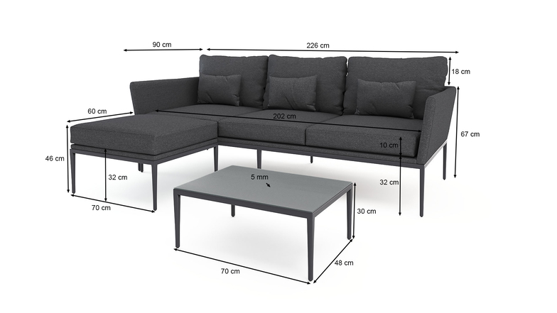 SKU 902612806 Kissen & Auflagen hoher Sitzkomfort2, dicke Rückenpolster, Kunstfaser, 10 cm dicke Sitzauflagen, Schaumstoff Eigenschaften Traglast bis zu 120 kg pro Sitzplatz, wetterbeständig, pflegeleicht, Quick Dry Foam, Schaumstoff Material Aluminium, Polster Montage Montage nicht erforderlich Tischplatte Milchglas, ESG-Sicherheitsglas, anthrazit2, Stärke 5 mm Lieferumfang 1x Hocker, 1x Tisch, 1x Sofa Gestell Aluminium, pulverbeschichtet, robust, rostfrei, wetterbeständig Produktart Sitzgruppen Bezug Graphitgrau, abnehmbar, waschbar bei 30°C, robuste Verarbeitung, hohe Festigkeit, verdeckte Reißverschlüsse, mehrfarbig, vorimprägniert, durchgefärbt Farbe anthrazit Gewicht ca. 36 kg Abdeckplane (Optionales Zubehör) Schutz vor Schmutz und intensiver UV-Strahlung, im Shop erhältlich, 245x95x60 cm Sicherheitshinweise