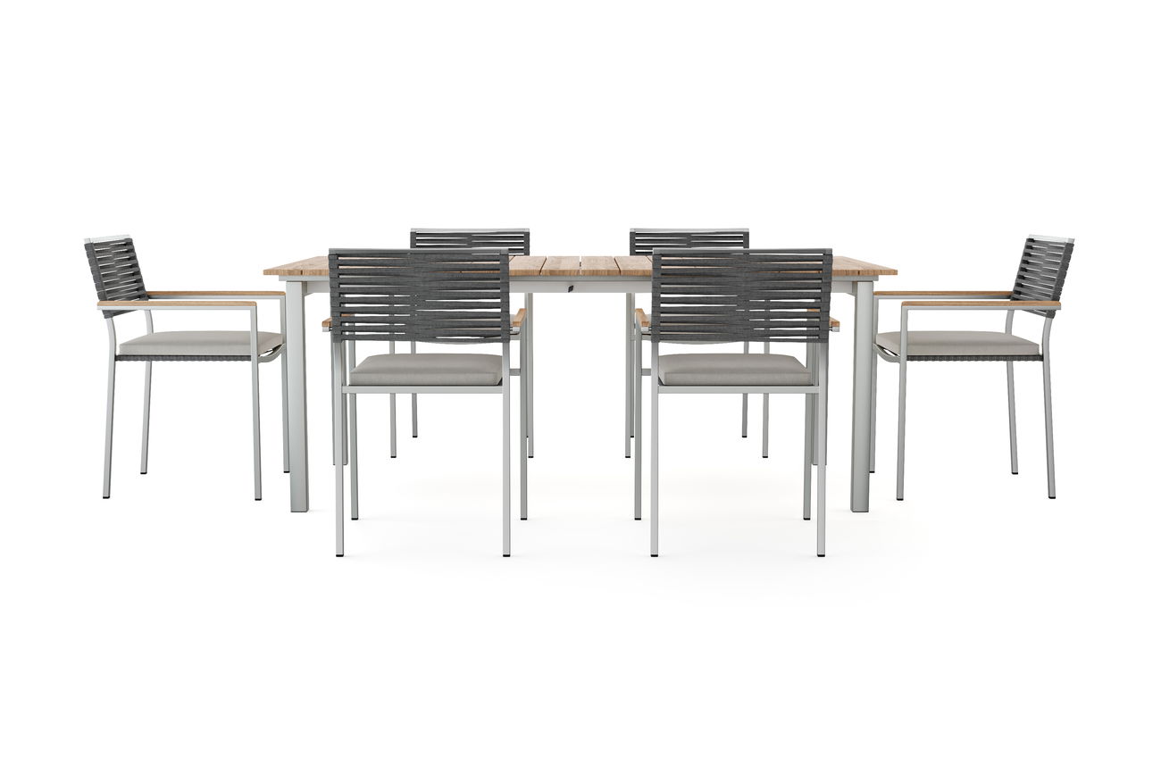 Farbe silber-metallic Kissen & Auflagen 5 cm dicke Sitzauflage, Schaumstoff, Taupe Gewicht Sitzgruppe ca. 40 kg Material Edelstahl, Teakholz, Rope Montage Montage nur beim Tisch erforderlich Tischplatte Teakholz, ausziehbar Lieferumfang 1x Esstisch, 6x Stuhl, Sitzauflagen inklusive Sitzplätze bis zu 6 Obermaterial Rope: grau Gestell Edelstahl, robust, rostfrei, Tischbeine 5 x 5 cm, Stühle und Tisch aus 304er Edelstahl, matt Bezug Taupe, 100% Polyester, abnehmbar, waschbar bei 30°C, hohe Festigkeit, einfarbig, vorimprägniert, durchgefärbt Eigenschaften Traglast bis zu 110 kg pro Sitzplatz, Teakholz, nicht stapelbar, ohne Auflage nutzbar, Tisch: ausziehbar SKU 23361 Sicherheitshinweise