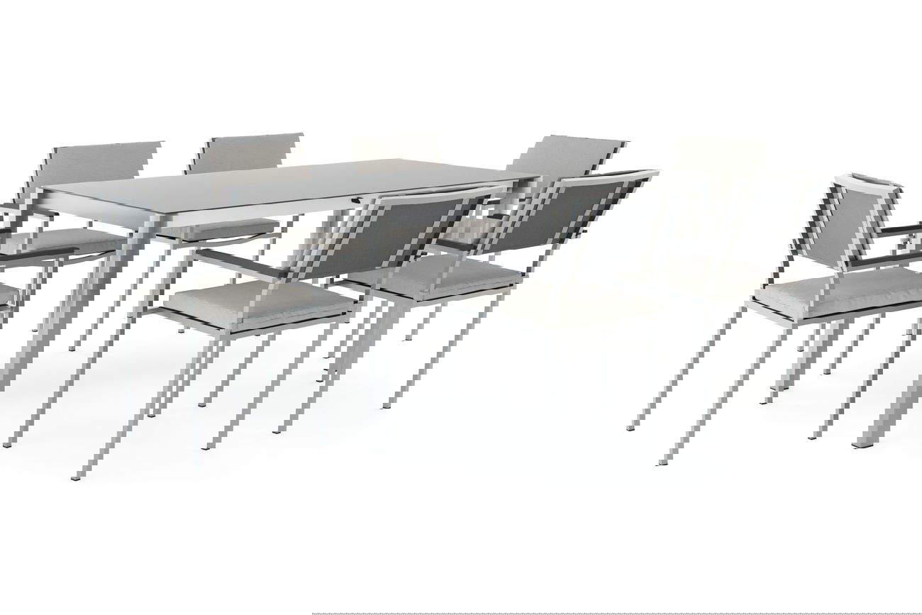 Die Essgruppe besteht aus sechs Stühlen, die nicht nur mit großzügigen 5 cm dicken Sitzkissen und 3 cm dicken Rückenkissen ausgestattet sind, um Ihnen und Ihren Gästen höchsten Komfort zu bieten, sondern auch stapelbar sind, um bei Bedarf Platz zu sparen und Flexibilität zu gewährleisten. Jeder Stuhl verfügt über ein robustes Edelstahlgestell, das nicht nur für seine Langlebigkeit bekannt ist, sondern auch ein Symbol für zeitlose Eleganz darstellt. Die Sitz- und Rückenflächen sind mit Textilene bezogen, einem luftdurchlässigen Material, das auch an warmen Abenden für angenehme Frische sorgt.