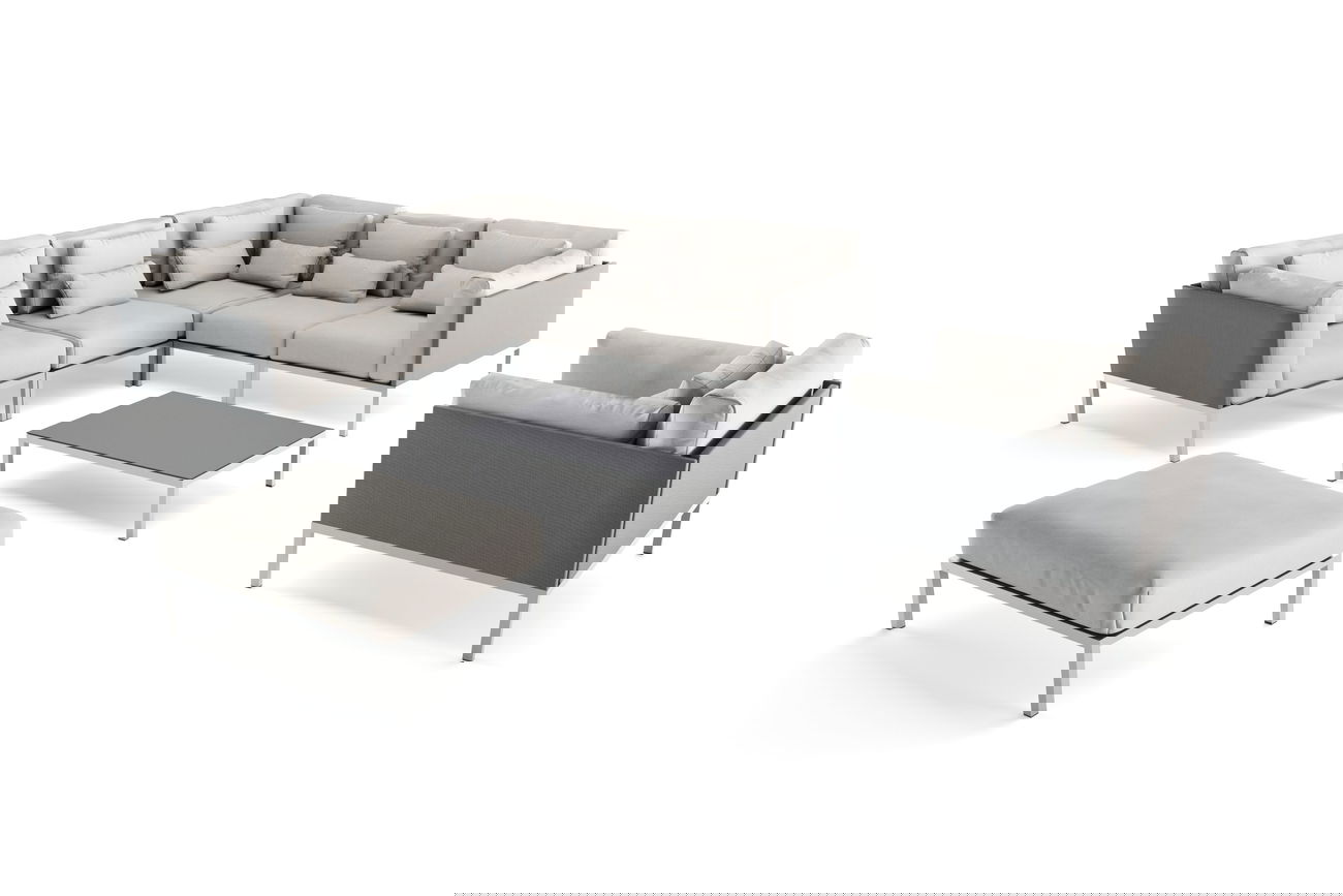 Mit einem Ensemble, das einen Hocker, einen Sessel, zwei Mittelsofas, ein Ecksofa, zwei Abschlusssofas und einen Loungetisch umfasst, bietet die Suite Lounge Max Platz für bis zu sieben Personen. Die Tischplatte aus 5 mm dickem Milchglas rundet das Design perfekt ab und schafft eine elegante und praktische Oberfläche für Ihre Outdoor-Unterhaltung.