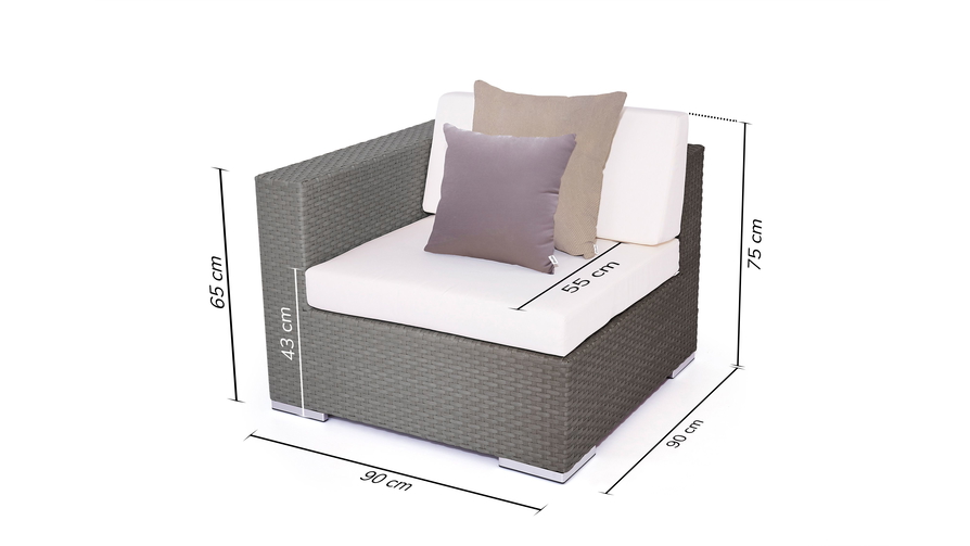Kissen & Auflagen 12 cm dicke Sitzauflage, Schaumstoff, hoher Sitzkomfort, Rückenpolster in Keilform, Schaumstoff, Dekokissen, Kunstfaserfüllung, wie abgebildet Gewicht Sofa ca. 15 kg Material Polyrattan Montage Montage erforderlich Lieferumfang inkl. Verbindungsklammern und Dekokissen Sitzplätze bis zu 1 Obermaterial Hochwertiges Polyrattan, 12 mm breit, angeraut, wasserfest, 100% handgeflochten, Farbe: anthrazit, einfarbig, durchgefärbt Gestell Aluminium, pulverbeschichtet, Stärke bis zu 1,2 mm, robust, rostfrei, wetterbeständig Bezug crema, 100% Polyester, abnehmbar, waschbar bei 30°C, robuste Verarbeitung, hohe Festigkeit, verdeckte Reißverschlüsse, einfarbig, durchgefärbt, vorimprägniert Eigenschaften Traglast bis zu 120 kg pro Sitzplatz, wetterbeständig, pflegeleicht, 15 cm breite Arm- und Rückenlehne, Modul individuell konfigurierbar und frei positionierbar, Kunststoff-Füße mit Alu Blende in Edelstahl-Optik SKU 902531101 Sicherheitshinweise