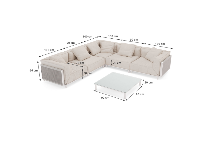 Abdeckplane (Optionales Zubehör) 300D starkes Polyester, Innenseite PVC beschichtet, doppelte Naht, robuste Verarbeitung, Lichtechtheit 4, sehr gut, Schutz vor Schmutz und intensiver UV-Strahlung, Tunnelzug mit Stopper Kissen & Auflagen hoher Sitzkomfort, Dekokissen, Kunstfaserfüllung, dicke Auflage, 25 cm dicke Sitzauflagen, Schaumstoff Material Aluminium, Champagne, Rope Montage Montage nicht erforderlich Tischplatte Milchglas Lieferumfang 2x Mittelsofa, 1x Ecksofa, 2x Ecksofa, 1x Loungetisch, inkl. Sitzauflagen Sitzplätze bis zu 5 Obermaterial einfarbig, durchgefärbt Gestell Aluminium, pulverbeschichtet Light Champagne, robust, rostfrei, wetterbeständig Bezug 100% Polyester, Beige , 100% Polyester, abnehmbar, waschbar bei 30°C, robuste Verarbeitung, edle Kedernaht, Zopfmuster Naht, hohe Festigkeit, hochwertige Kunstfaser, vorimprägniert, verdeckte Reißverschlüsse Eigenschaften Traglast bis zu 120 kg pro Sitzplatz, wetterbeständig, pflegeleicht, Gestell mit Rope Bespannung SKU 37910 Sicherheitshinweise